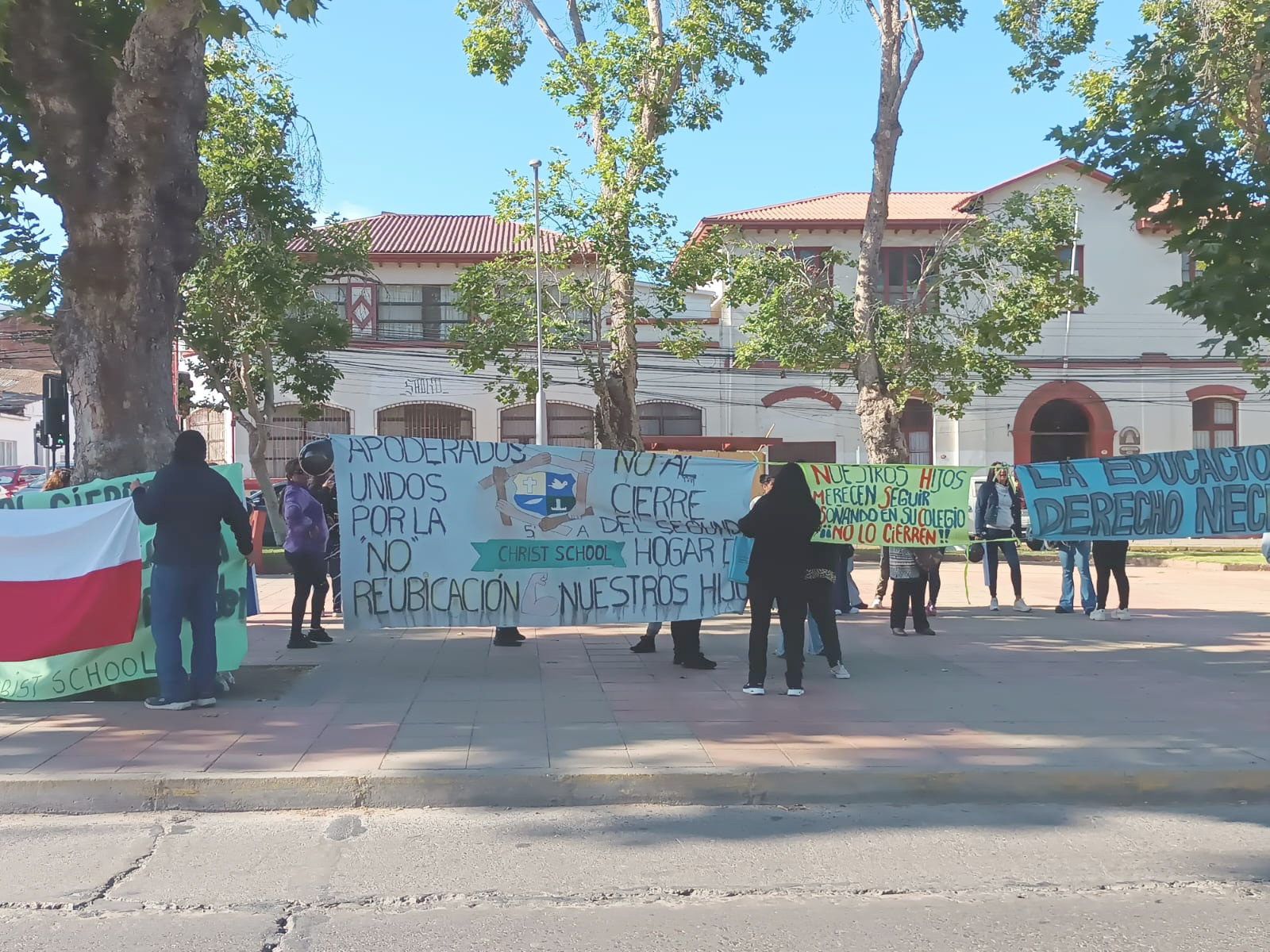 Con pancartas y consignas frente a la Seremi de Educación de Coquimbo, un grupo de apoderados del Colegio Christ School de La Serena se manifestó la mañana de este lunes exigiendo respuestas ante el cierre del establecimiento y la falta de cupos para reubicar a sus hijos.