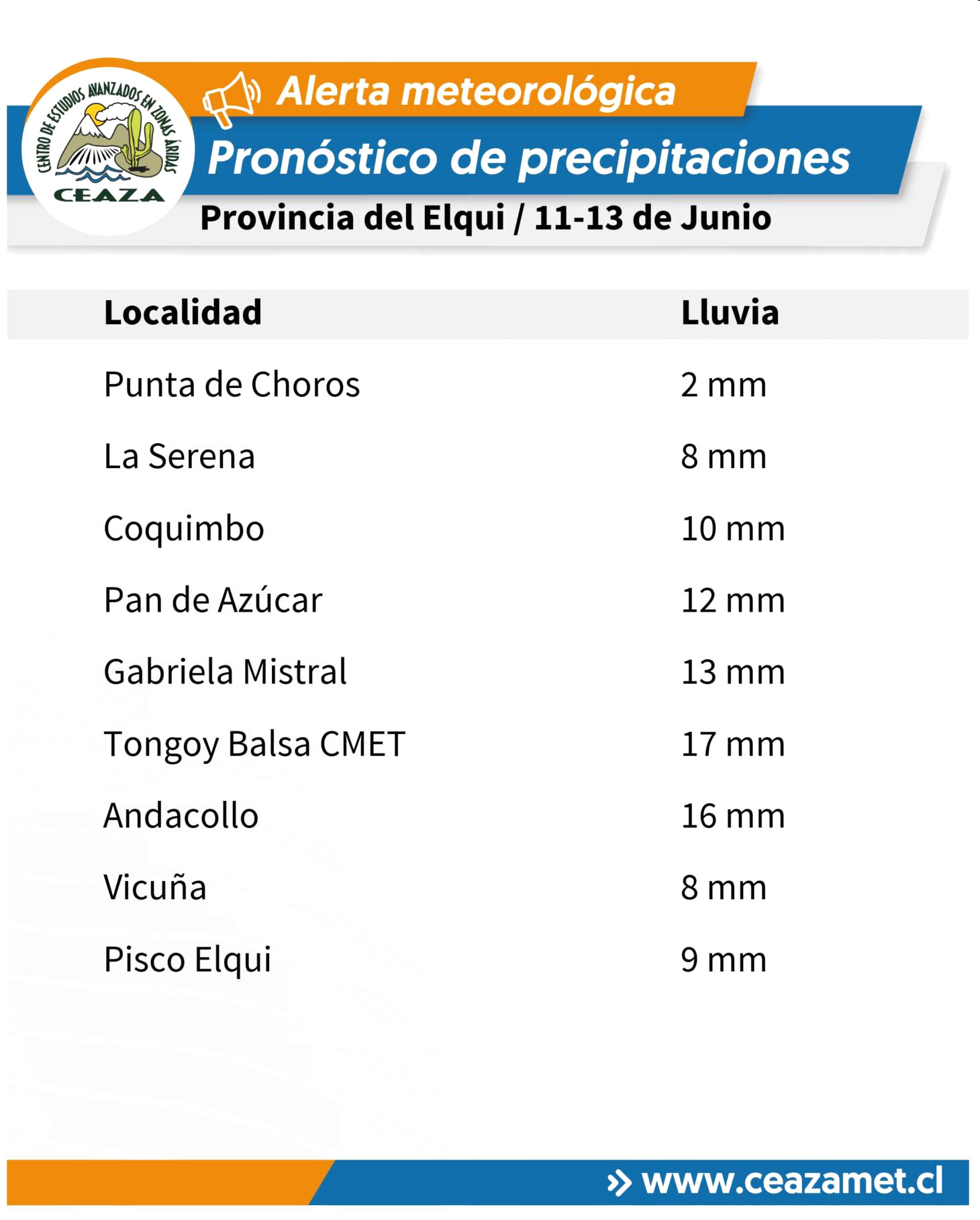 En la provincia del Elqui, principalmente en La Serena y Coquimbo, se estiman lluvias entre 5 y 10 milímetros. Hacia el interior, en Vicuña y la precordillera, podrían caer entre 8 y 10 milímetros, mientras que en sectores cordilleranos se esperan hasta 12 centímetros de nieve.