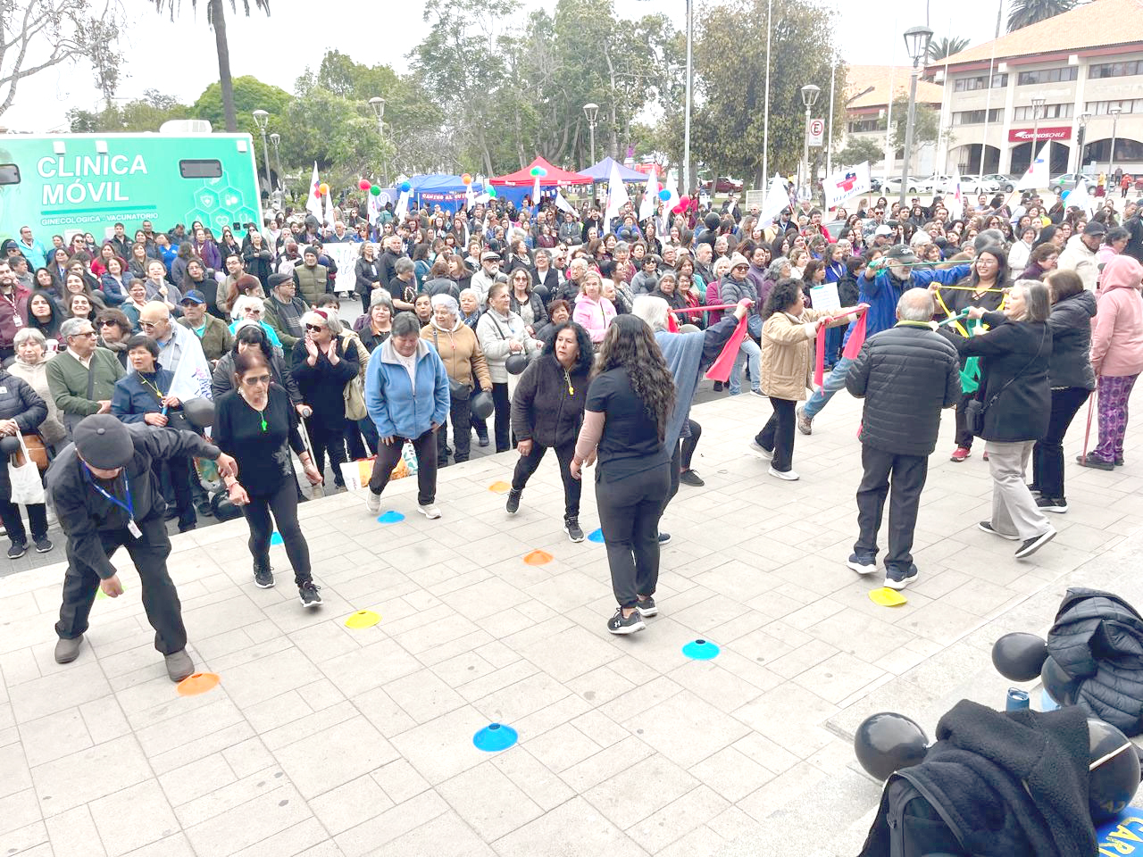 La intervención fue protagonizada por los adultos mayores y sus kinesiólogos, quienes montaron una demostración pública de los talleres que realizan cada martes y jueves. En medio de aplausos, formaron estaciones de ejercicios y comenzaron a moverse con instrucciones, animándose unos a otros, demostrando cómo el programa les ha devuelto la alegría que muchos habían perdido.