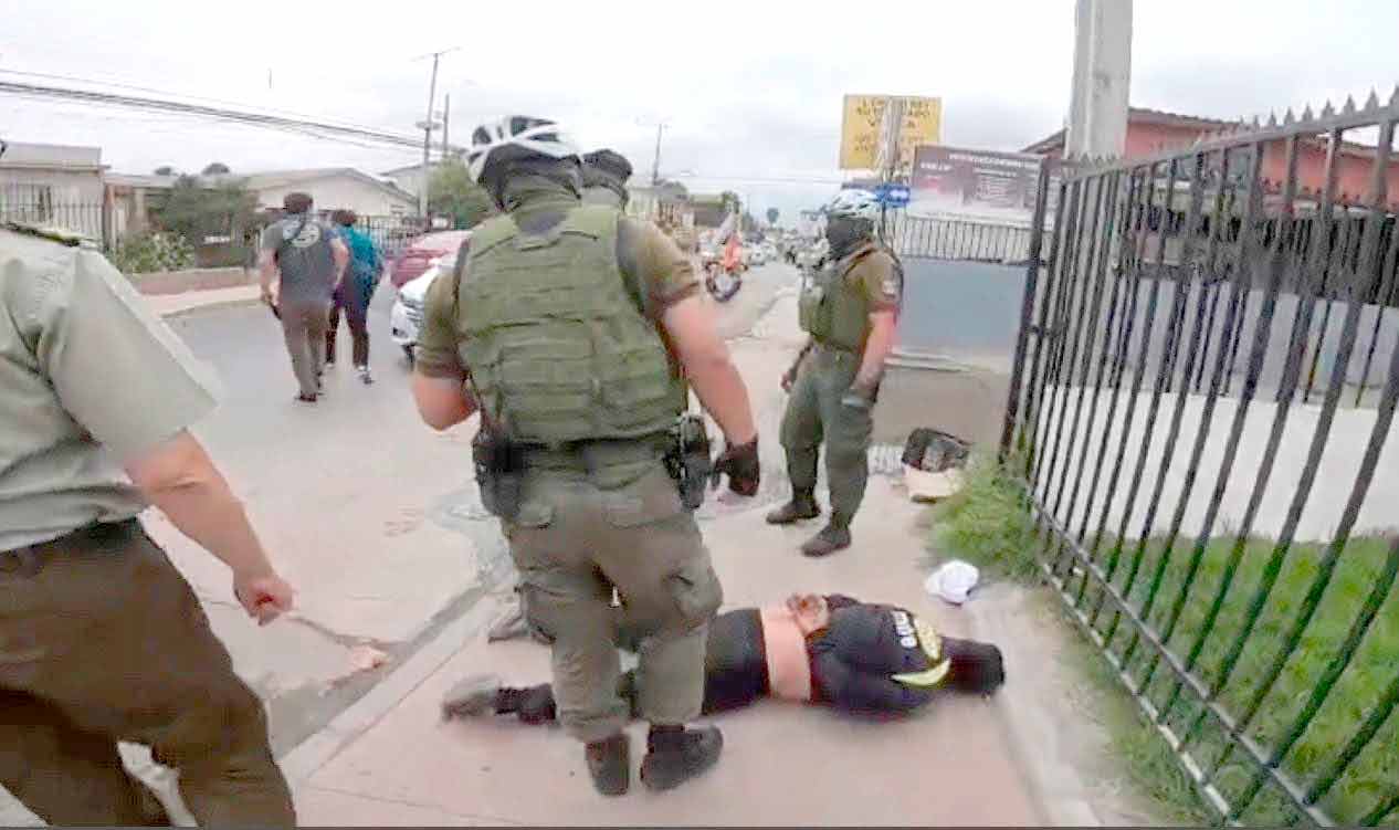 En las imágenes del arresto se puede ver cómo al menos cinco Carabineros junto a Seguridad Municipal tenían retenido boca abajo al agresor, quien yacía en el piso con las manos esposadas.