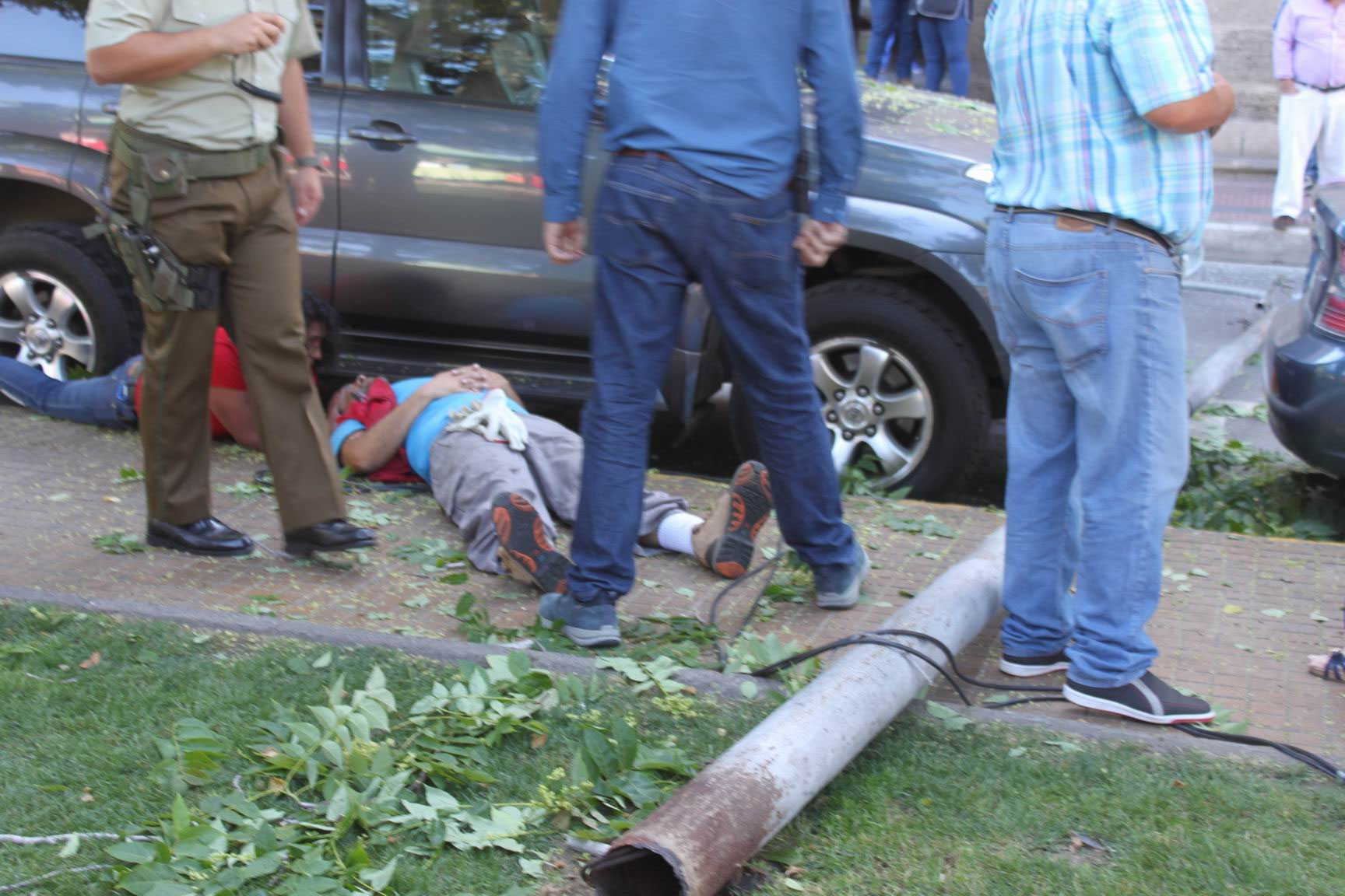 Además, dos vehículos que se encontraban estacionados en calle Los Carrera presentaron daños por la caída del poste.